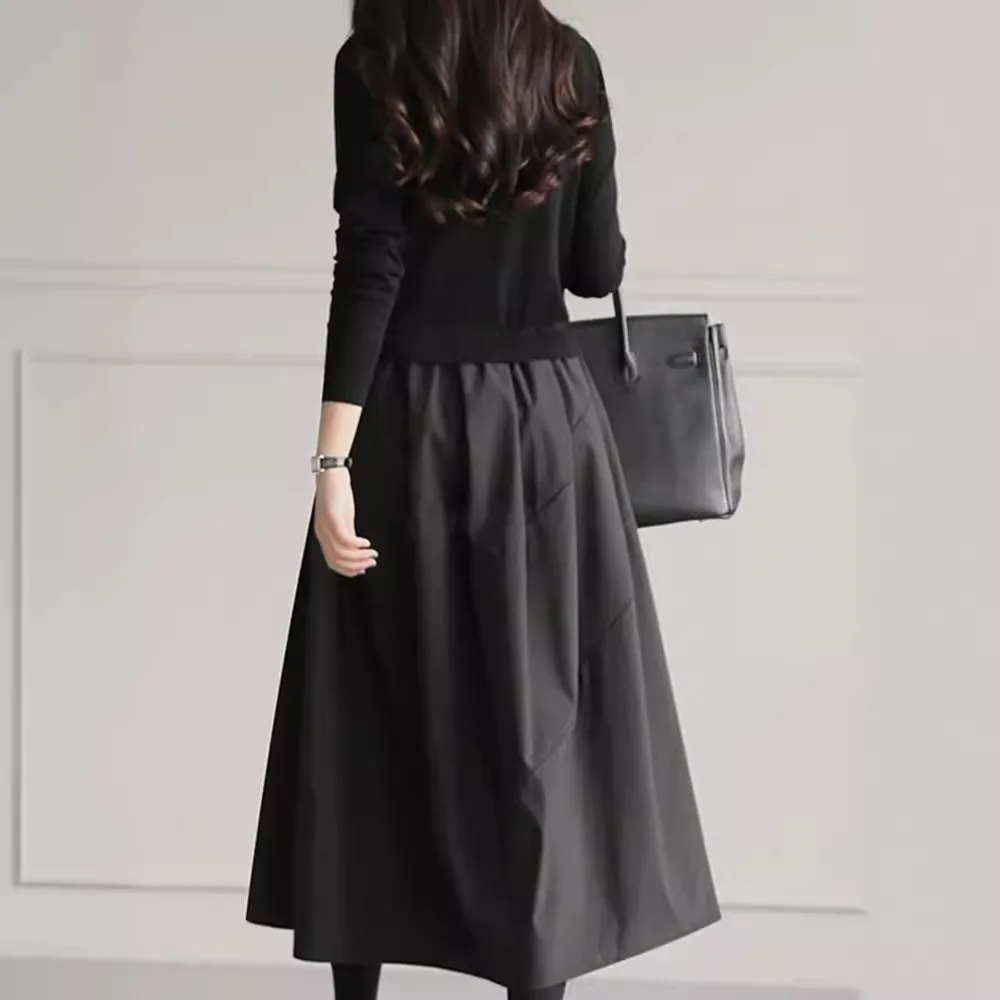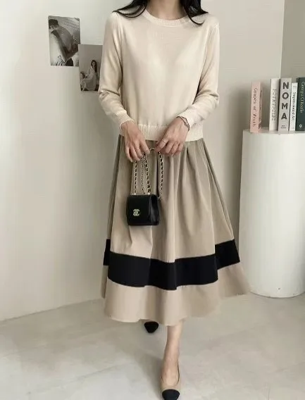 Vintage Elegant Knitted Top Splicing Dress Korean Style Spring 2025 New Women Maxi Dresses Casual Loose A-line O-Neck Dresses